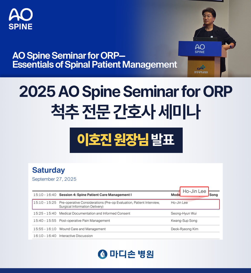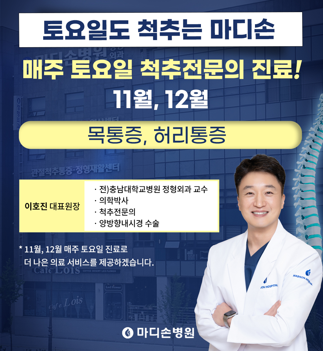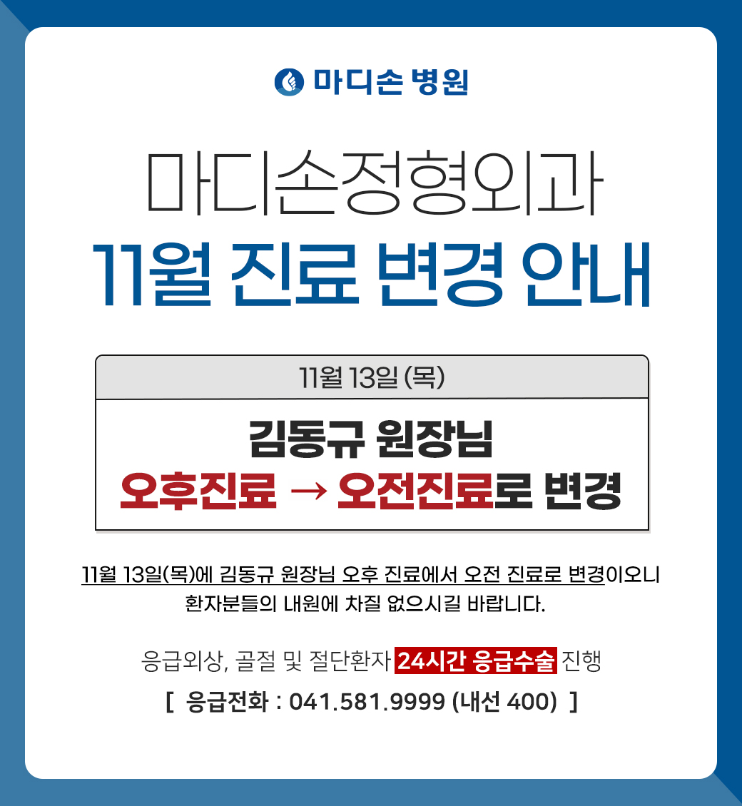 마디손소개 인사말 의료장비소개 병원 둘러보기 오시는 길 의료진소개 의료진 소개 진료안내 진료안내 진료시간 비급여공지 척추센터 양방향내시경 허리디스크 목디스크 척추측만증 척추관협착증 척추압박골절 거북목증후근 경추관협착증 통증클리닉 수부미세접합 수부미세접합 복합수부손상 손가락인공관절 방아쇠수지 수근관증후군 결절종 테니스엘보 관절/인공관절 관절경 무지외반증 소아정형외과 소아정형외과/교정치료 평발 다른다리길이 발달성 고관절 탈구 휜다리 LCP병 기운고개 뒤꿈치통증 일과성 고관절 활액막염 오스굿병 자주묻는질문 골절/외상/스포츠손상 골절/외상/스포츠손상 줄기세포연골재생 카티스템 줄기세포 연골재생 커뮤니티 마디손 스토리 언론 속의 마디손 공지사항 자주묻는질문 정형수부수술24시간 응급수술 시행 병원소개